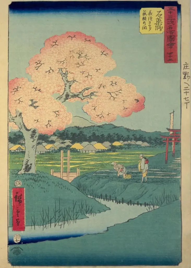 - 右上の背景: 歌川広重『五十三次名所図会 四十五 石薬師 義経さくら範頼の祠』