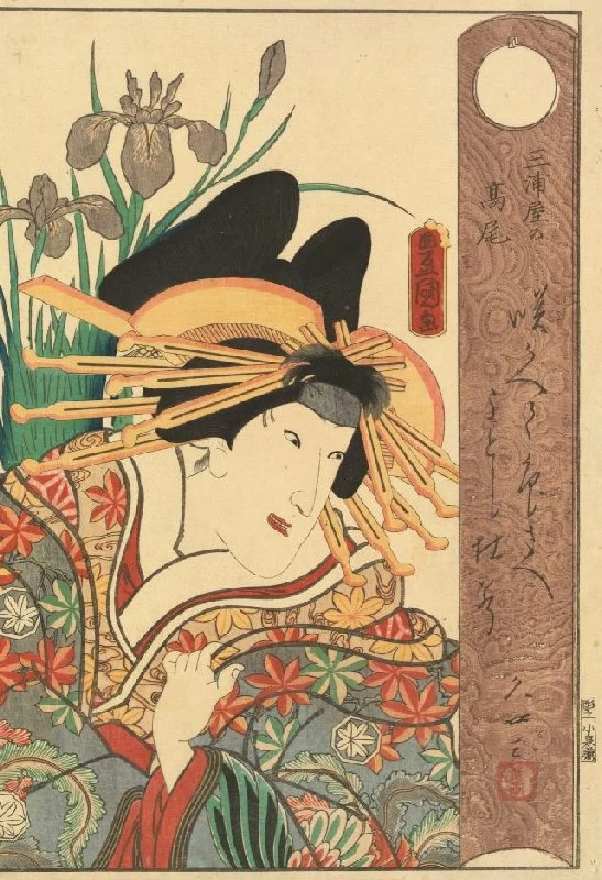 - 左中段: 歌川国貞(三代豊国)『三世岩井粂三郎の三浦屋高尾』(花魁姿の役者絵です)