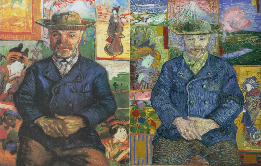 そして、皆さんが「2枚ある?」と気になっているのが、その後に描かれた2つのバージョンです。これらは背景が鮮やかな浮世絵で埋め尽くされており、ゴッホのジャポニスム(日本趣味)への傾倒が色濃く反映されています。