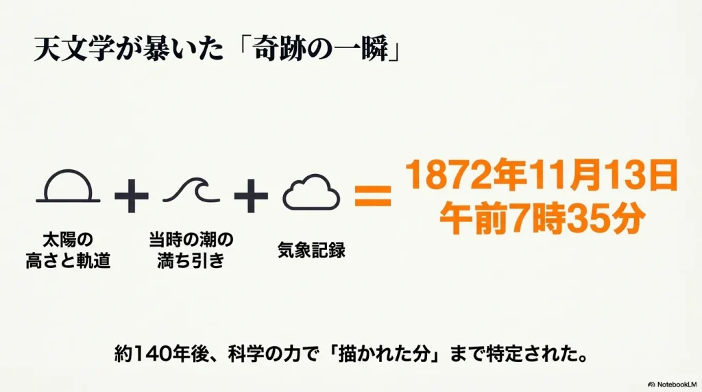 しかし近年、アメリカの天文学や物理学の専門家チームが、地形データや太陽の軌道、当時の潮の満ち引き(潮位表)、気象記録などを徹底的に調べ上げました。その結果、この絵が描かれた正確な日時が1872年11月13日 午前7時35分頃(夜明けの約30分前)であると科学的に証明されたんです!